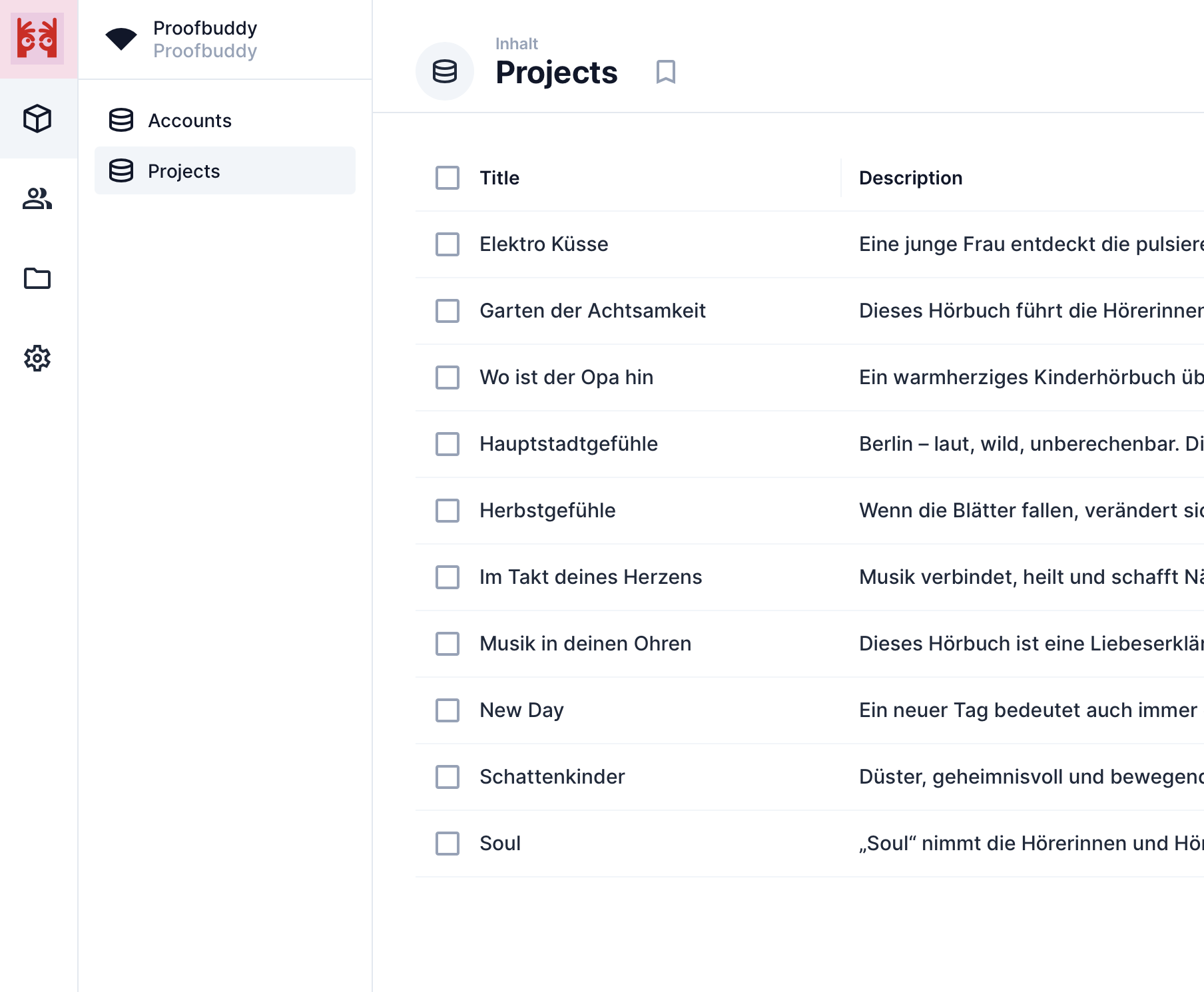 In einem übersichtlichen Content Management System können Verlage, Publisher und ProduzentInnen ihre Hörbuchprojekte anlegen, TesthörerInnen zuordnen und den Prozess steuern.